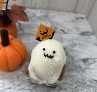 もっちり求肥でくるりと包んだおばけケーキ。可愛いお顔の下は純生クリーム、シフォン、イチゴムースを忍ばせています。